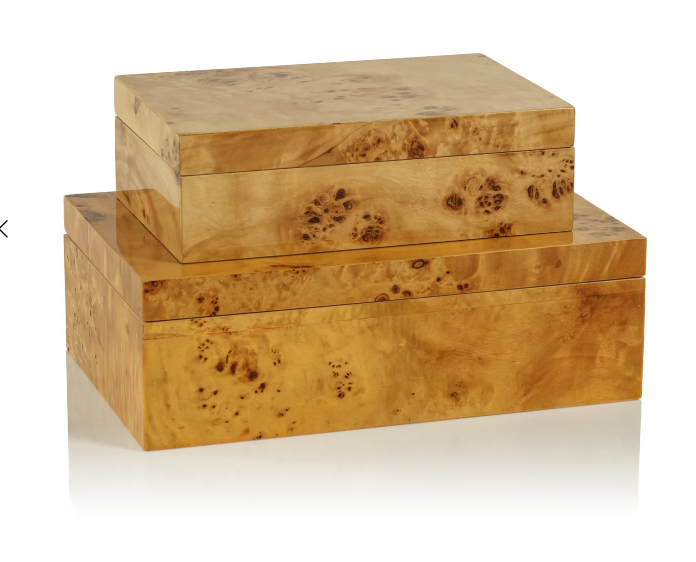 Fabulous burl wood boxes. A great addition to a side table, bookcase, etc. Availabel in two sizes: